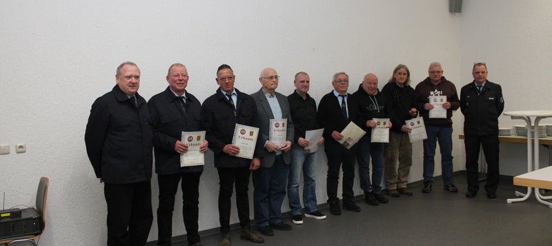 Martin Riess, Kay Wagner und Ursula Reitz wurden für 25 Jahre Vereinsmitgliedschaft geehrt. Matthias Eberbach, Stefan Donges und Vorsitzender Klaus Baron sind schon 40 Jahre im Verein. Bereits ganze 50 Jahre Mitglied im Verein sind Manfred Durlas, Horst Tabery und Jürgen Hahn.